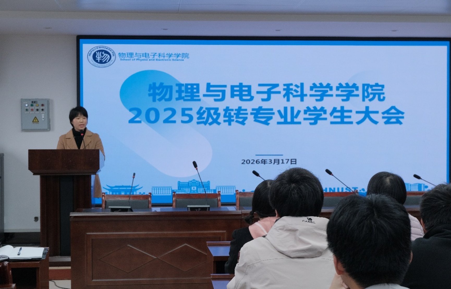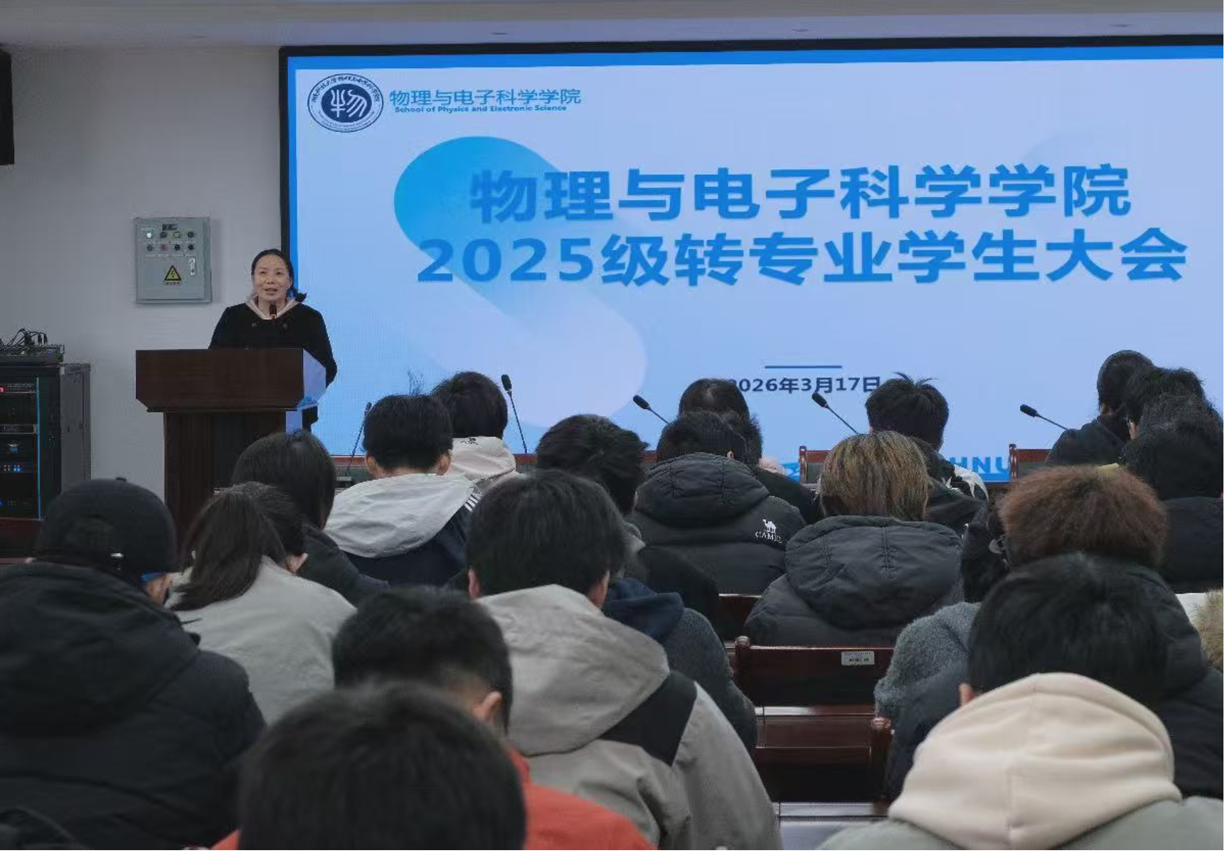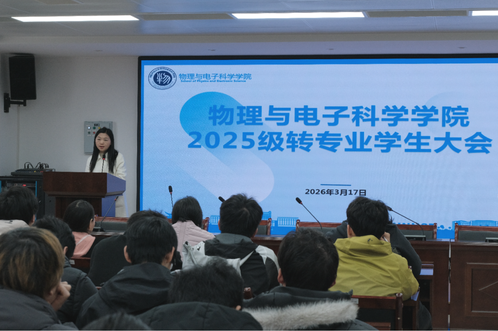 本学期,物电学院接收转专业学生100名,为帮助新转入的学生熟悉学院情况,了解规章制度,融入新的学习生活,3月17日下午,物理与电子科学学院在知行楼B509召开2025级转专业学生大会。学院党委副书记贺玲,学工办主任徐文璐,教务办主任李祉娣,专职组织员龙睿,教务办曹春晓老师,2025级辅导员张华、王玮出席本次大会,会议由王玮主持。