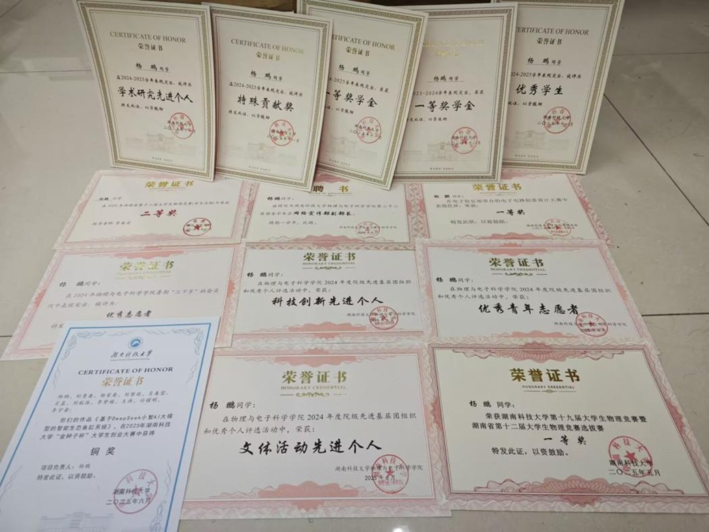 申请到校友助学金之后,我便全情投入学习。大一学年,我以平均学分绩 87.92 位列专业第五,斩获校级综合一等奖学金;彼时,彭洁老师常鼓励我,为我普及大学生活的信息差,提供学习上的建议与帮助,让我信心倍增。大二学年,我的成绩进一步提升到 90.37,位列专业第二、综测第一,并获得国家奖学金。除此之外,我主动向叶欣学长了解科创竞赛方面的信息,在湖南省第十二届大学生物理竞赛中取得省级二等奖、全国大学生节能减排社会实践与科技竞赛中夺得三等奖,在校级 “金种子杯” 中收获铜奖,更以第一作者身份取得软件著作权一项。这些成果源于我学习的动力,而我学习的动力,正源于国家和社会的支持。