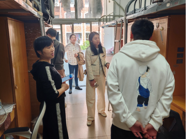 走访过程中,贺玲一行重点检查了寝室卫生环境、用电安全及公共区域管理等情况,针对个别寝室存在的杂物堆放、通风采光等问题提出整改意见,并强调安全责任意识。老师们与同学们就近期学习科研进展、生活需求进行交流,提醒学生增强安全意识,遵守校规校纪,共同维护宿舍环境。